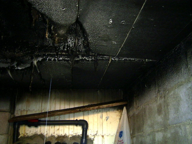 Here in the background you can also see the wall of the pool made of polystyrene blocks and that the ceiling did not catch fire. |